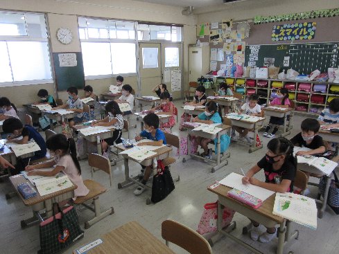 1時間目は国語の授業でした。「ぬ」の練習をしたあと、「は」「を」「へ」を使って文を書きました。