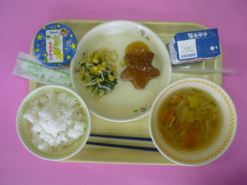 ご飯、牛乳、星のハンバーグおろしだれ、三色和え、七夕汁、七夕デザート