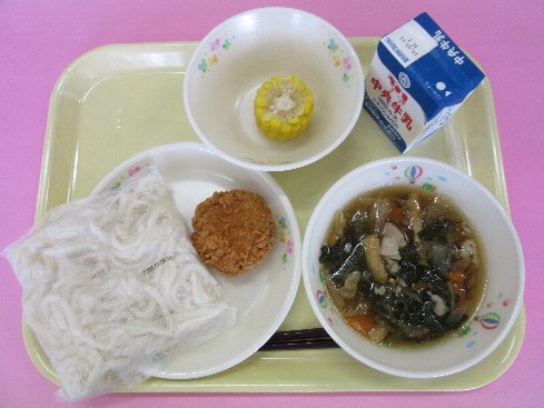 五目うどん(白玉うどん)、牛乳、鶏天、カットコーン