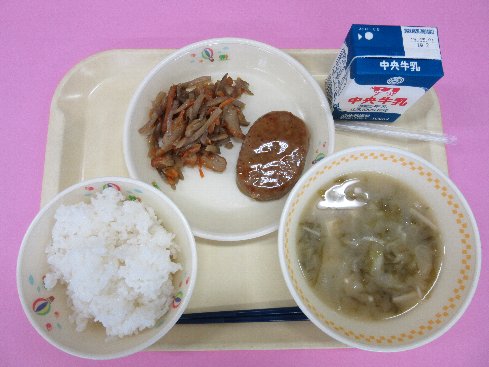 ご飯、牛乳、和風ハンバーグ、金平牛蒡、アオサ汁