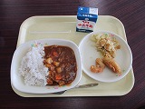 カレーライス(麦ごはん)、牛乳、白身魚フリッター、ふくじんあえ