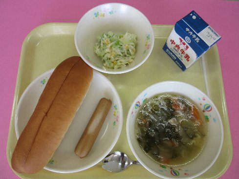 サンドロールパン、牛乳、フランクフルト、コールスローサラダ、コンソメスープ