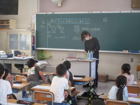 どちらが多く入っているか予想しながら、かさ調べしていました。