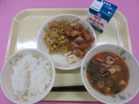 ご飯、牛乳、チキン南蛮、牛蒡サラダ、薩摩芋の味噌汁
