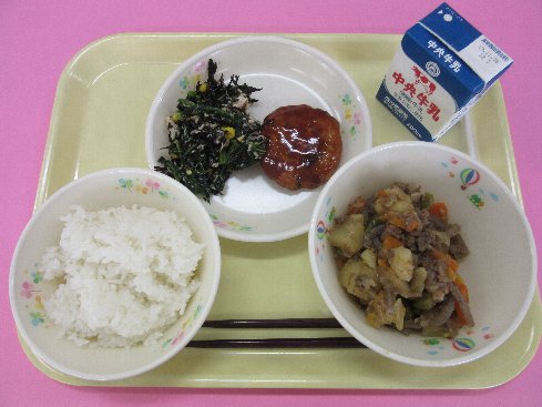 ご飯、牛乳、お好み半平、じゃがいものうま煮、ひじきの和え物