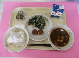 ご飯、牛乳、ゴボウ入りつくね、チンゲンサイの和え物、豚汁、巨峰とマスカット