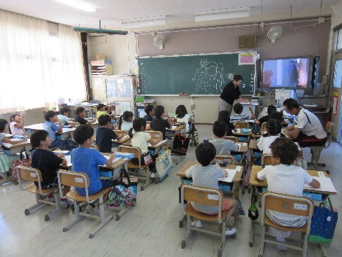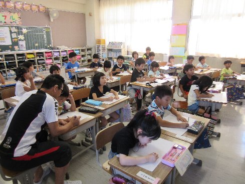 1・2時間目は図画工作の授業でした。「おおきなかぶ」の場面の絵を描きました。