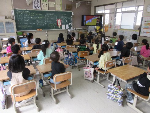 5月1日(火)4時間目は国語の授業でした。ひらがなの学習を進めています。今日は大型テレビを使って「ら」に挑戦しました。