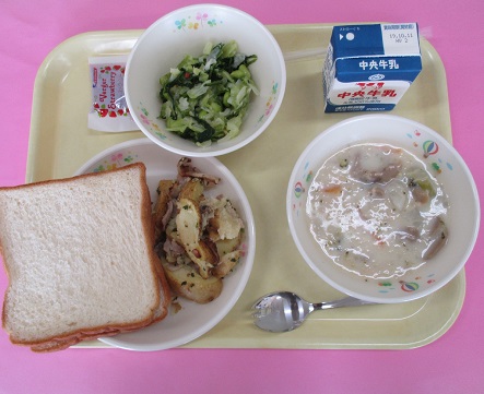 スライスパン、牛乳、イチゴジャム、ジャーマンポテト、ホタテのクリームシチュー、グリーンサラダ