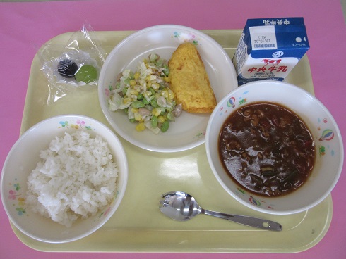 ハヤシライス(ご飯)、牛乳、オムレツ、コロコロサラダ、巨峰&マスカット
