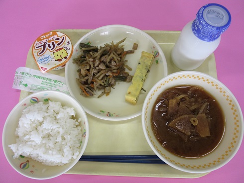 ご飯、牛乳、愛知の五目厚焼き卵、金平ゴボウ、つみれ汁、プリン