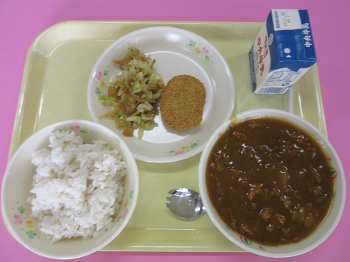カレーライス(麦ご飯)、牛乳、薩摩芋コロッケ、福神和え