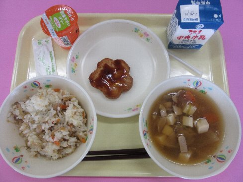 かきまわし(ご飯)、牛乳、花形半平、具だくさん汁、野菜と果物ゼリー
