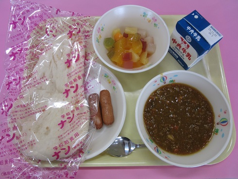 ナン、牛乳、野菜たっぷりキーマカレー、ミニウインナー、フルーツ和え