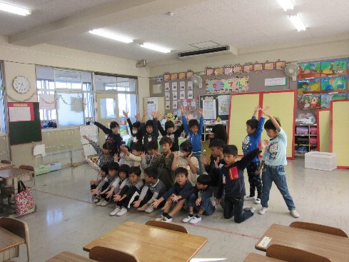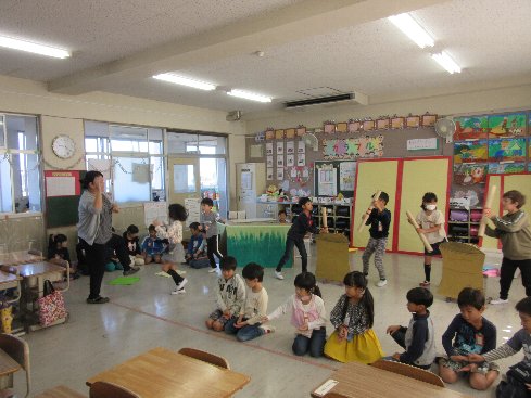 1時間目は学習発表会の練習をしました。実際に小道具類も使って、通し稽古をしました。
