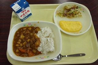 麦ごはん、牛乳、豆入りカレーライス、オムレツ、福神和え