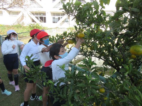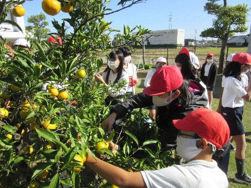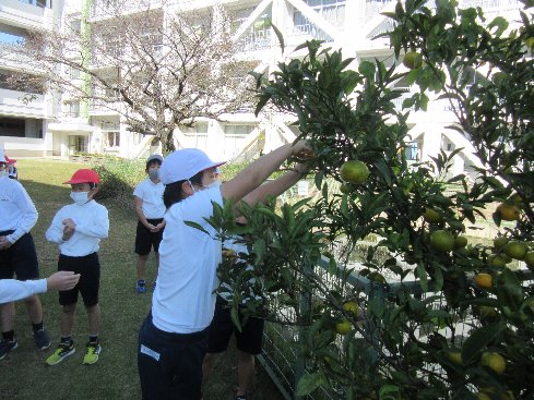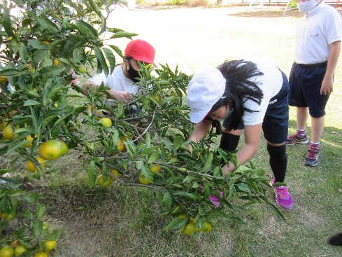 今年は、中庭の温州みかんがたくさん実りました。全校児童分ありそうだったので、6年生から順番にみかん狩りをしました。実りの秋ですね。