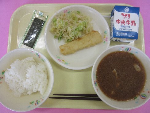 ご飯、牛乳、烏賊の天麩羅、沢庵和え、豚汁、味付け海苔