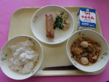 ご飯、牛乳、春巻き、八宝菜、青梗菜のナムル