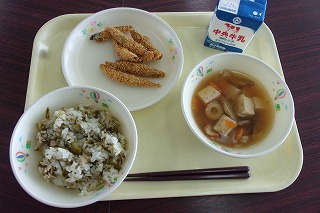 たかなご飯、牛乳、きびなごのから揚げ、つぼん汁