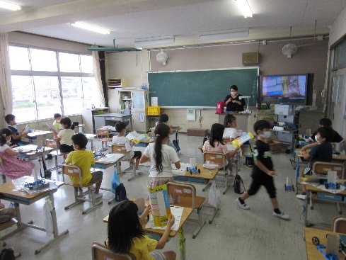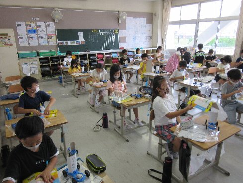 5時間目は理科の授業でした。風の働きの実験用のキットで、風力自動車を作りました。