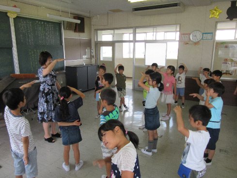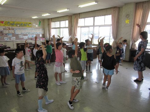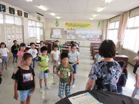 1時間目は音楽の授業でした。音階を手の高さで示しながら歌いました。