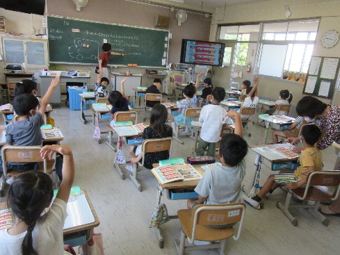 1時間目は算数の授業でした。バスに乗っているのは何人か、考えました。