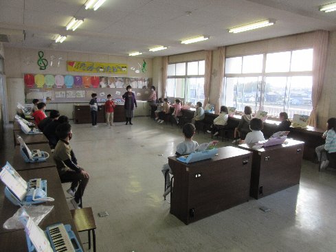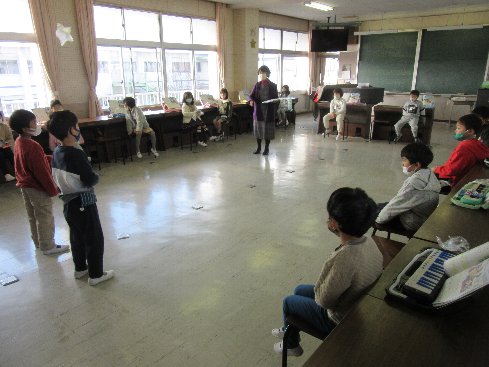 1時間目は音楽の授業でした。「日の丸」を音階と、音の高さを手振りで表現して歌いました。