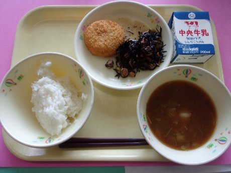 ご飯、牛乳、ひじきの炒め煮、さつま芋コロッケ、白菜の味噌汁