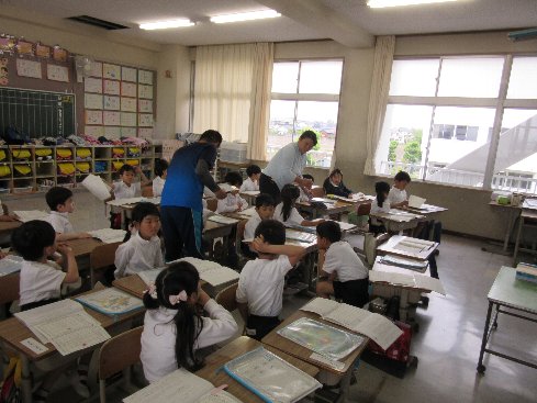 1時間目は算数の授業でした。授業の前に、音読カードの書き方を確認しました。