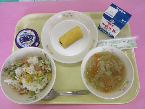 海老ピラフ(ご飯)、牛乳、ウインナー卵焼き、野菜スープ、ブルーベリーゼリー