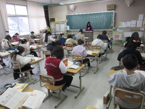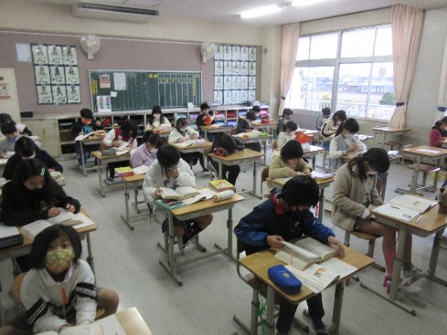 1時間目は国語の授業でした。熟語の意味を考えるときに、訓をてがかりに考えて、辞書を使って調べました。