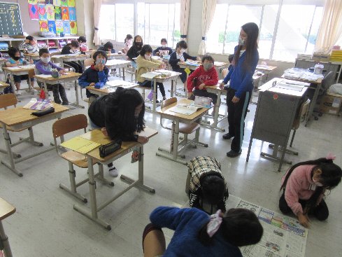 2時間目は算数の授業でした。1㎡を新聞紙で実際に作ってみて、実際の面積を体感しました。