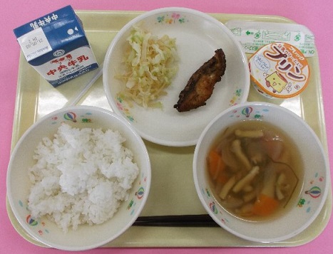 ご飯、牛乳、メバルの立田揚げ、沢庵和え、昆布汁、プリン
