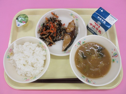 ご飯、牛乳、鰤の照り焼き、おすわい、蟹と小松菜の味噌汁、一口洋梨ゼリー