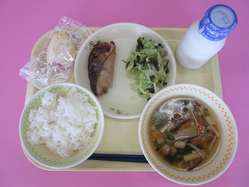 ご飯、牛乳、さばの塩焼き、小松菜のおひたし、具だくさん汁、スイートポテト