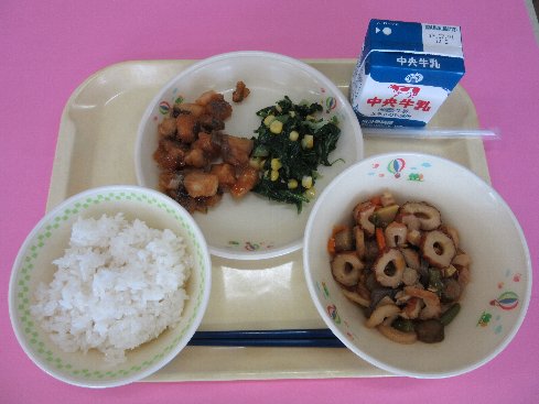 ご飯、牛乳、白身魚の揚げ照り、筑前煮、和風サラダ