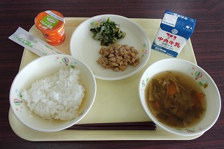 ご飯、牛乳、ネギ鳥丼、磯香和え、具だくさん汁、野菜ゼリー