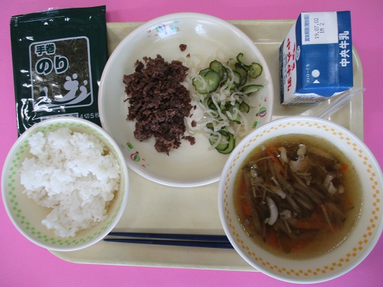 手巻きご飯(ご飯・のり)、牛乳、(牛肉のしぐれ煮)(即席漬け)さわにわん