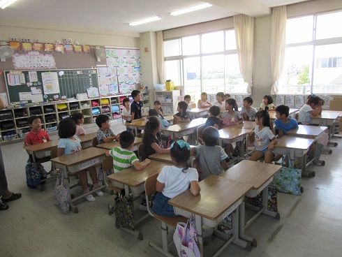5月7日(月)今日から運動会練習が始まると言うことで、着替えに時間のかかる1・2年生は朝礼前に着替えました。朝礼の後、そのまま体育館で1・2年合同の朝の会を行いました。