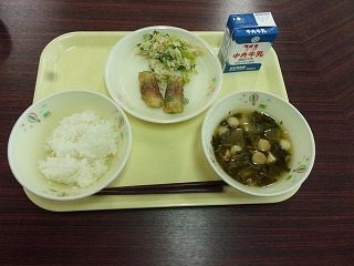 ご飯、牛乳、ちくわのいそべあげ、チンゲンサイのあえもの、ふのすまし汁