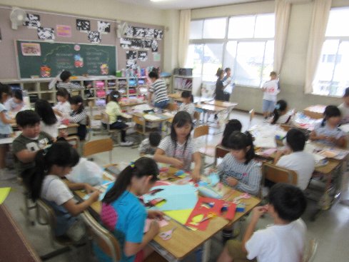 7月10日(火)3時間目は図工の授業でした。「はさみのアート」ということで、黒色画用紙に白色の画用紙を切って作品を作りました。