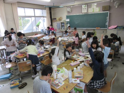 2時間目は図画工作の授業でした。「作ってあそぼう」という内容で、1年生を招待して遊ぶためのおもちゃをそれぞれがつくっていました。
