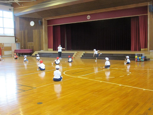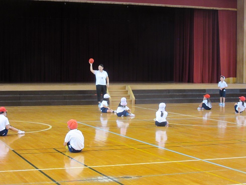 5月7日(月)今日から運動会練習が始まると言うことで、着替えに時間のかかる1・2年生は朝礼前に着替えました。朝礼の後、そのまま体育館で1・2年合同の朝の会を行いました。