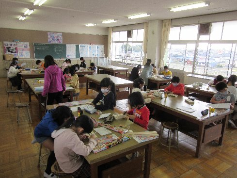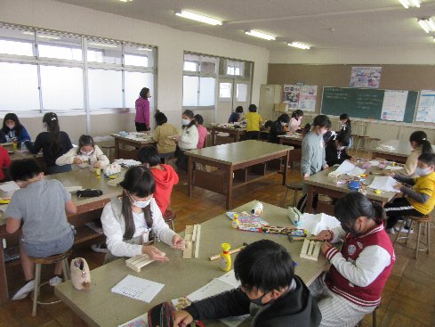 3・4時間目は図画工作の授業でした。ギコギコトントン、金槌やのこぎりを使って木材を加工して様々な形を作りました。