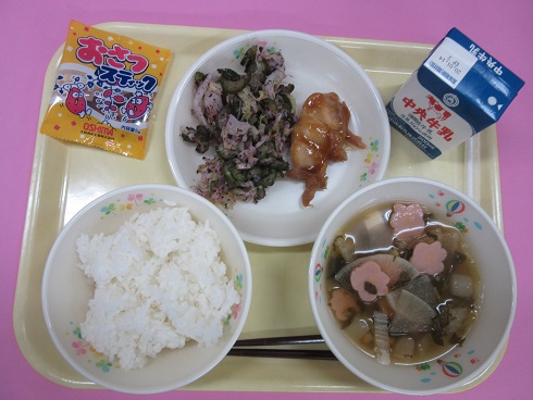 ご飯、牛乳、鶏肉のたれかけ、紫蘇和え、七草汁、おさつスティック