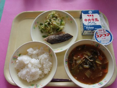 ご飯、牛乳、ホッケの塩焼き、いんげんのボア和え、小松菜の味噌汁、ヨーグルト