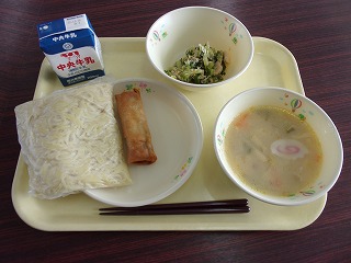 パイタンラーメン(中華麺)、牛乳、はるまき、バンバンジー