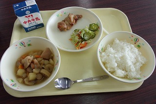ご飯、牛乳、とり肉のマーマレード焼き、根菜のポトフ、