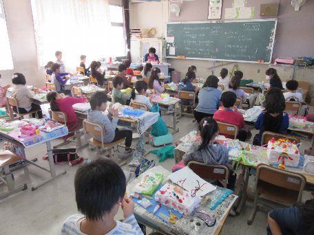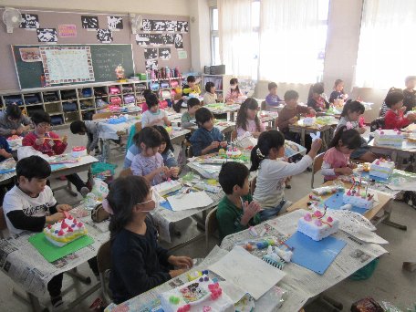 3時間目は図画工作の授業でした。それぞれが、思い思いのケーキを紙粘土で作りました。